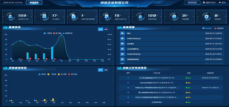 構建可視化數據中心看板集成匯總企業安全生產運行數據,涵蓋隱患情況、風險巡查情況、工作完成情況、預警預告情況、到期提醒、物聯報警等,便于負責人全盤掌握企業安全管理動態。