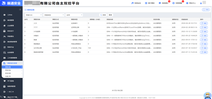 平臺提供隱患管理超期、證照(預)超期、工作計劃實施、風險定期巡檢、物聯感知、應急事件等多方面的預警,依需設置預警規則,支持短信、電話、微信等多途徑消息推送,實時提醒相關責任人進行處理;