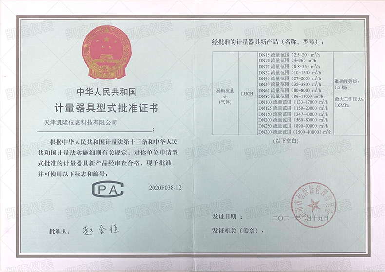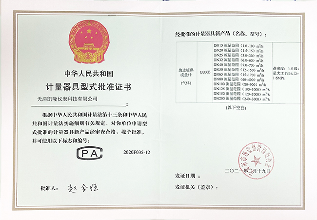 渦街流量計(jì)型式批準(zhǔn)證書(shū)