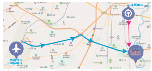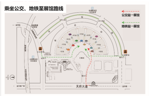 機(jī)場(chǎng)至展館: 乘坐地鐵10號(hào)線(新平-太平園)雙流機(jī)場(chǎng)2航站樓上車-太平園B口下車, 步行360米,換成84路,武陽大道三段上車-新會(huì)展中心北側(cè)下車,步行52 米到達(dá)。